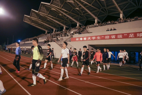 开幕式后,“迎省运”足球友谊赛揭幕战激情上演,施培智为揭幕战开球,东道主安徽科技学院大学生足球队迎战蚌埠医学院大学生足球队。在全场球迷的呐喊声和助威声中,双方球员迅速进入状态,在高强度、快节奏的比赛中你来我往,打出了行云流水、赏心悦目的进攻配合。最终双方以0:0握手言和。(特约通讯员:张聪)