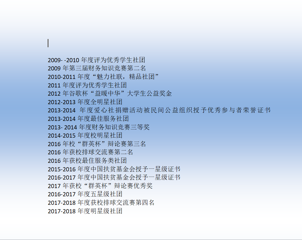 大一期间获得:校级“仰望星空 脚踏实地”课件制作与演示二等奖、校级运动会女子仰卧起坐第六名、国家级环保知识竞赛优秀奖、财经学院创新创业大赛三等奖、财经学院运动会女子400米第一名、2017-2018年“社团积极分子”称号、校级“优秀青年志愿者”称号。