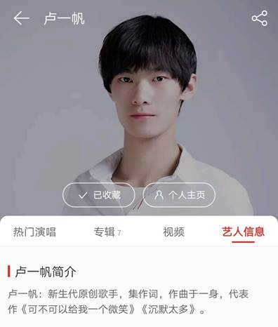 卢一帆在2018年“腾讯原创音乐人”中获得全国前百强的名次,2017年发布的原创单曲“抹不去的痕迹”和2018年发布的“渐变”均成为网易云音乐首页热搜单曲;