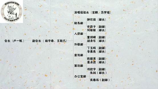 2、职能部门:办公室、策划部、财务部、人资部、外联部、宣传部、演唱组。