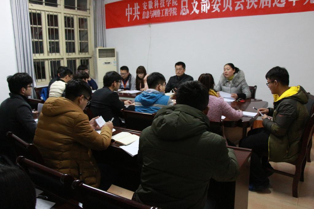 12月23日下午,信息与网络工程学院在院会议室召开各班级班长会议,部署期末学生工作和凤阳县人大换届选举学生投票选举工作,党总支书记王振其出席会议并讲话,会议由副处级辅导员韦乃学主持。