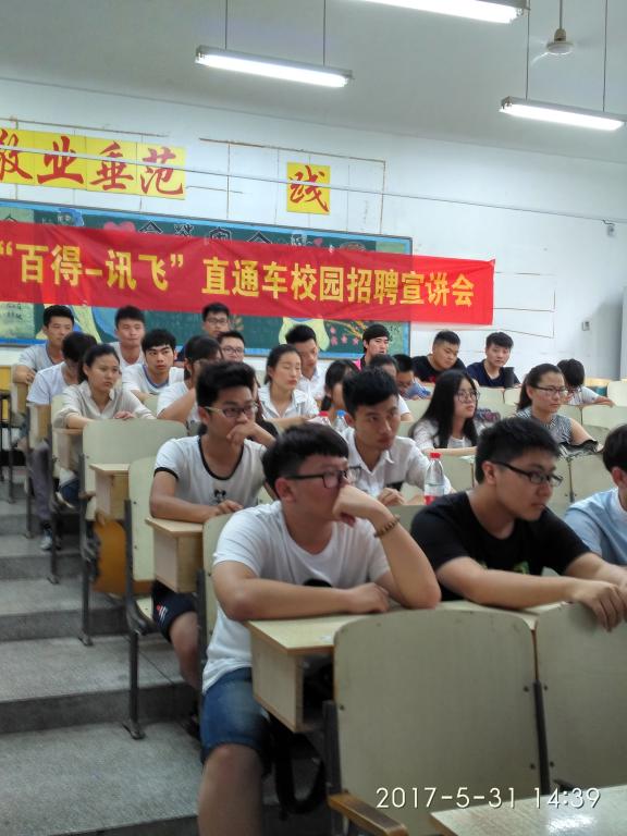 5月31日下午,“安徽百得—讯飞直通车”校园招聘宣讲会在求知楼A101教室成功举行,信息与网络工程学院2018届毕业生86人参加了宣讲会,宣讲会由信息与网络工程学院党总支书记王振其主持。