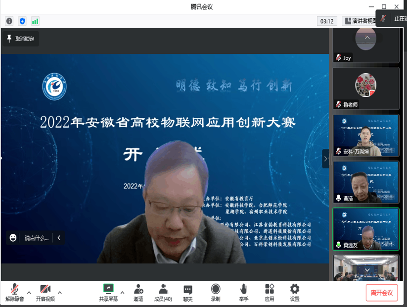11月13日上午,由安徽省教育厅主办,安徽科技学院信息与网络工程学院承办的2022年安徽省高校物联网应用创新大赛在我校龙湖校区如期举行,安徽科技学院副院长黄远友出席开幕式并致开幕辞。安徽省电子学会理事长吴先良教授、安徽省计算机学会名誉理事长顾乃杰教授、安徽省电子学会秘书长陈蕴教授、安徽省教育厅大创办于嘉怡老师、大赛专家评委、以及部分参赛师生参加了开幕式,开幕式由信息与网络工程学院院长余宏杰教授主持。
