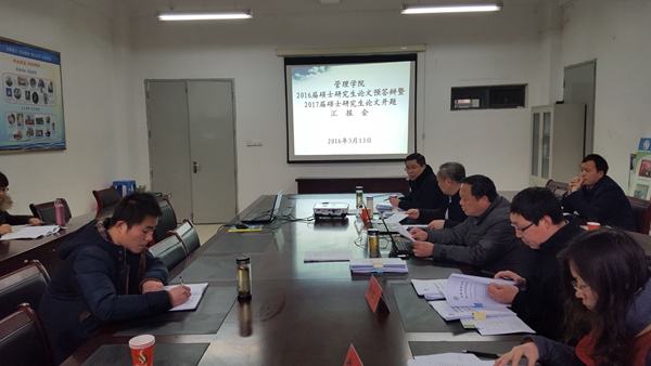 3月13日,管理学院2016届硕士研究生论文预答辩及2017届研究生开题报告会在学院会议室举行,报告会由答辩组组长、管理学院院长顾有方主持。预答辩委员会由宿州市委党校副校长柳建国教授、管理学院程业炳教授、郝世绵副教授和财经学院金怀玉副教授组成,管理学院部分教师和全体研究生参加了会议。