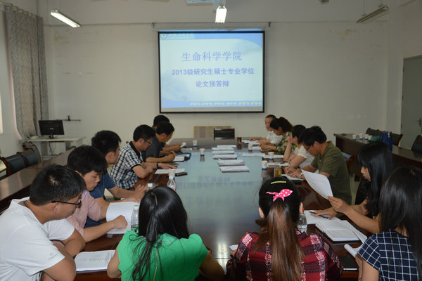 根据校研究生处工作安排,6月8日下午,生命科学学院在学院会议室举行2013级农业硕士研究生毕业论文预答辩,研究生处秘书张古品老师应邀参加了此次答辩会,院长金光明教授担任本次研究生学位论文答辩委员会主任,委员由外事处副处长王松华教授、学生处副处长何华奇副教授、生科院副院长高青海副教授、园艺教研室主任陆晓民教授和生物技术教研室祝嫦巍副教授组成,周玉丽老师担任答辩秘书,13级全体研究生参加了预答辩。