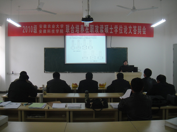 12月7日,我校首届(2010级)与安徽农业大学联合培养硕士研究生学位论文答辩会在研究生教室举行。副校长刘正教授、安徽农业大学研究生院院长林毅教授及於忠祥教授、李桂亭教授、赵海泉教授、研究生教育办公室主任焦立新教授及相关专家参加了研究生答辩。