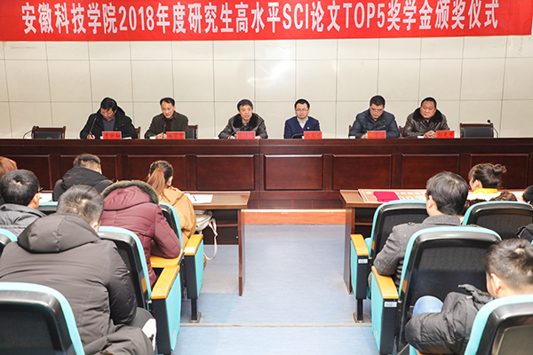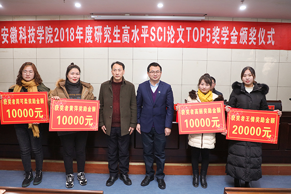 李升和宣读了2018年度高水平SCI论文TOP5奖励计划获奖研究生名单。王倩、高丽、黄萍、周可柔等4位同学获得“安徽科技学院2018年度高水平SCI论文TOP5奖学金”。