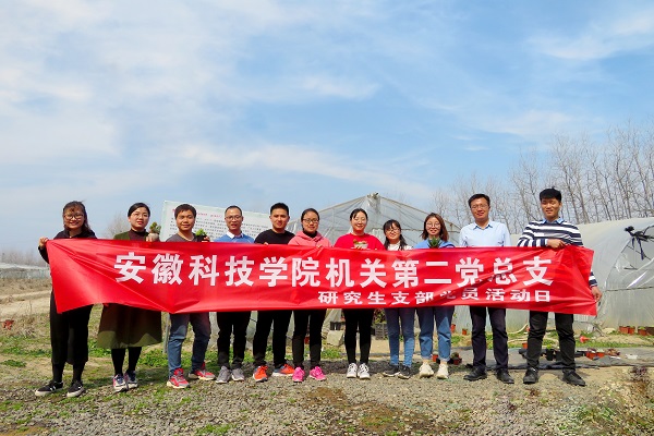 近日,机关第二党总支研究生支部全体在校生党员一行10余人前往我校位于凤阳县大庙镇东陵村的产学研基地开展主题党日活动。由于该基地多肉大棚近期需要集中清理翻修,急需人手,得知这一消息后,研究生党支部立即研究:干脆直接把党员活动日直接搬进多肉大棚里。说干就干,马上前往该基地帮助解决当前实际困难。