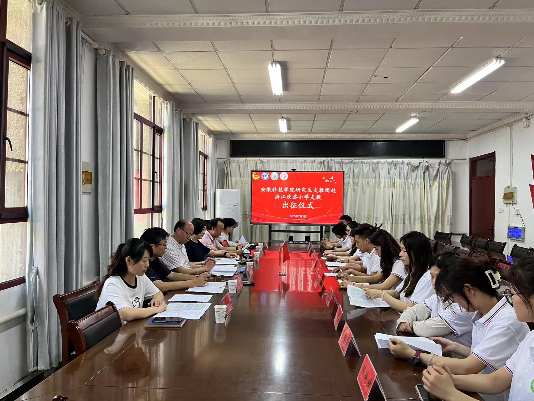 2025年7月3日上午,安徽科技学院研究生支教团赴浙江欢岙小学支教出征仪式在农学院会议室举行。校党委委员、副院长王孝义出席仪式,校团委书记张聪、研究生处老师和研究生支教团成员代表共同参加了此次仪式,仪式由党委研究生工作部部长张春雨主持。