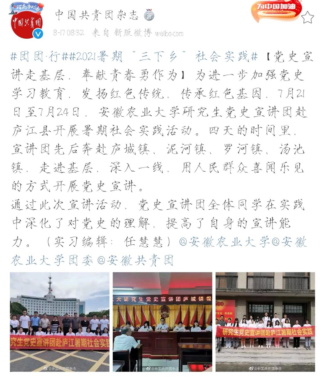 2.团队活动多次被安徽农业大学微信公众号、研途安农等多个微信公众号以及中国共青团杂志微博转发,受到广泛关注和好评。