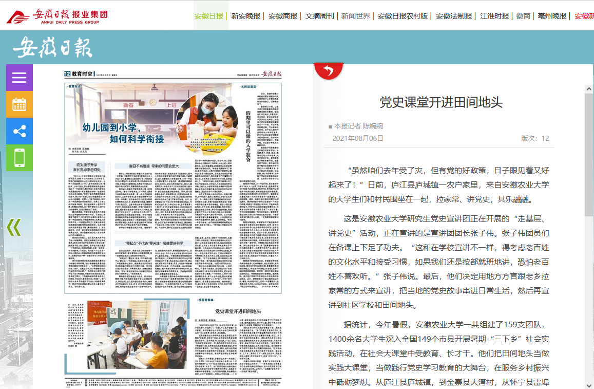 为深入学习习近平新时代中国特色社会主义思想,贯彻落实习近平总书记关于党史学习的重要指示精神,教育和引导广大青年学生学史明理、学史增信、学史崇德、学史力行,7月15日至8月15日,安徽农业大学组织研究生以集中宣讲与分散宣讲相结合,分赴基层一线开展党史宣讲工作,在基层一线历练,在奉献中担当成长。