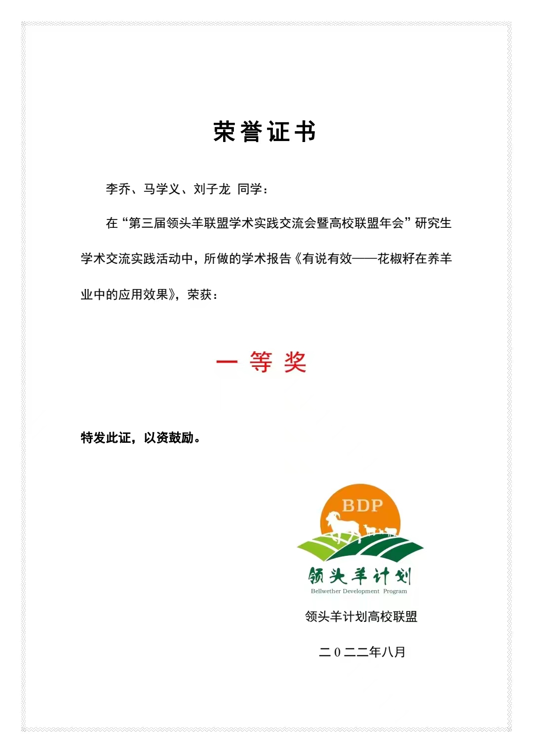 在专业实习实践过程中,团队成员做到真正“与羊为伍”,用自身专业优势,科技赋能羊产业,持续开展理论指导与技术帮扶。先后为羊场工作人员举办了“肉羊营养需求”、“羊同期发情技术要点”等技术讲座5场次,详解了不同生长阶段绵羊营养需求、同期发情、人工授精操作技术要点以及疫病防控知识等,使基地人员对相关知识有了进一步的了解和掌握,还就专业实践过程发现的10余个实际问题提出了解决措施,为羊场全方位推动高质量发展插上科技创新“翅膀”。活动期间,恰逢第三届“领头羊计划”学术实践交流会暨高校联盟年会,团队将实习实践所获进行了分享并荣获一等奖。