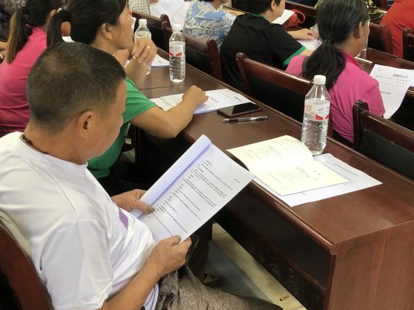农户在会上阅读一号文件 成员发放并讲解《达川乌梅栽培技术规程》手册
