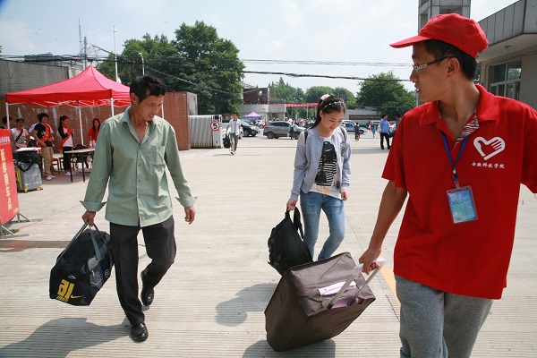 “食品药品学院的往这边”、“生科院的请跟我走”、“外国语学院的在这里”......新生接待车刚停下,来自各院系的迎新志愿者就迫不及待的上前,迎接新一届学弟学妹们的到来。注册、报道、领生活用品、充饭卡、进入宿舍......一路上,学长学姐们热情的一条龙服务瞬时间让新生同学们体会到了安科的温暖,感受到了家的温馨。