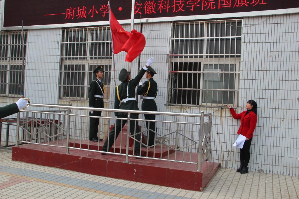 在安徽科技学院西区操场前,响起了威武雄壮的中华人民共和国国歌——这是每周一次的升旗仪式。仪式现场,王震站姿笔挺,表情庄重,正喊着口令,指挥着手擎国旗的升旗手来到升旗台前。随着他的一声令下,鲜艳的五星红旗撒向天空,伴随着慷慨的义勇军进行曲,迎着朝阳冉冉升起。国旗班队员们整齐列队,向国旗注目敬礼。
