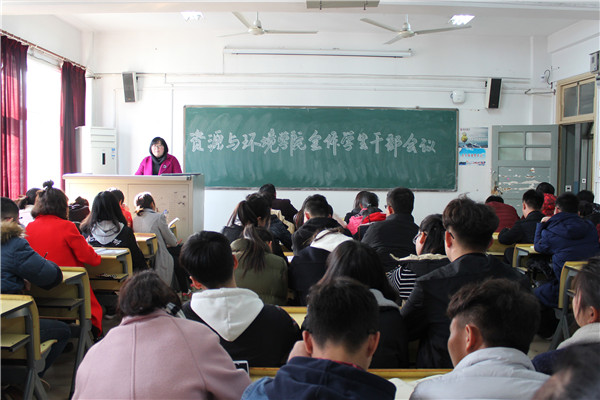 为加强学院全体学生干部自身素质建设,促进学习、工作能力的提高,2月15日下午,资源与环境学院在学知楼208召开本学期第一次全体学生干部会议。学院副处级辅导员谢宜勤,党总支秘书、分团委书记吴国良,2016级新生辅导员杨小晗以及全体学生干部参加了会议。会议由吴国良主持。