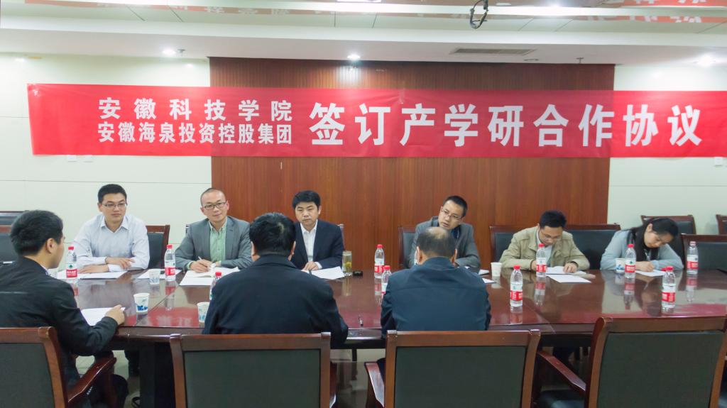 4月20日下午,安徽科技学院与安徽海泉投资控股集团产学研合作协议签约仪式在资源与环境会议室举行。校党委委员、副校长汪建飞、安徽海泉投资控股集团董事长李振华董事长、办公室主任孔令堂、秘书王辉、资源与环境学院副院长肖新及相关教师出席签约仪式。仪式由肖新主持。