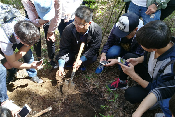 与此同时,同学们参观鹞落坪自然保护区人文馆和标本馆,领略鹞落坪的伟大红色文化以及珍贵丰富的野生保护动植物资源库,考察了在野外生长状态下存活五百年多年的“五针松”;并攀登了大别山第三高峰——“多枝尖”。多枝尖海拔1721米,自然风光优美、森林植被保存完好、人文资源丰富。经过一个多小时的跋涉,到达多枝尖的顶峰,领悟到山顶之上的美景,祖国山川的绮丽。张振国老师亲自挖掘土壤剖面,为学生讲解多枝尖上土壤剖面与其他地区的异同,加深对专业知识的理解,让自然地理随处能够得到解释。