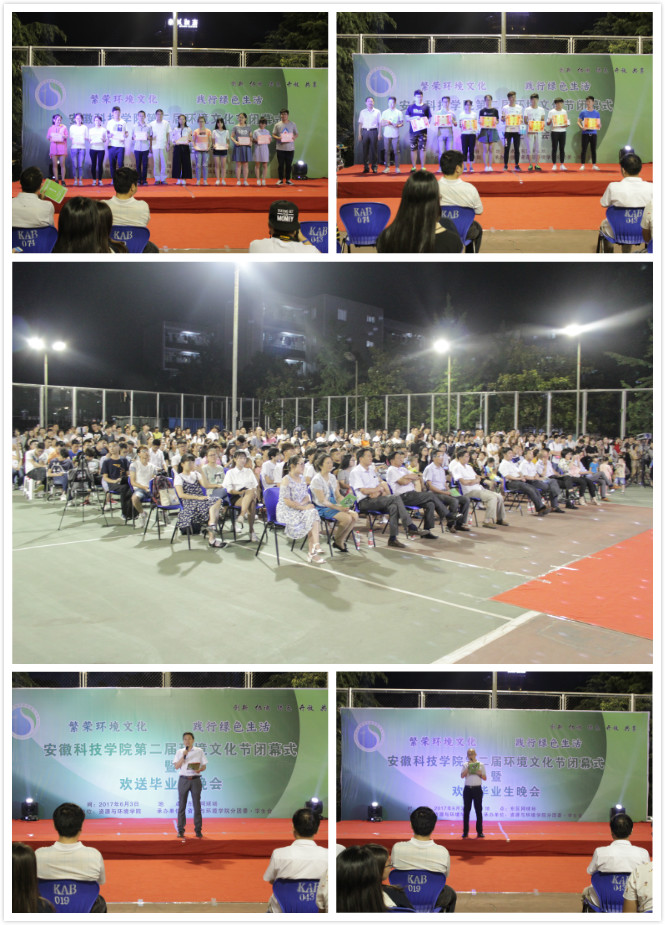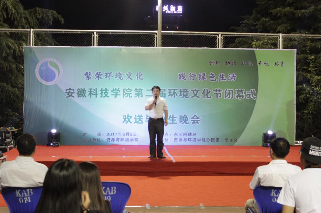 为迎接第46个世界环境日,6月3日晚,安徽科技学院第二届环境文化节闭幕式暨欢送毕业生晚会在校东区网球场隆重举行。校党委委员、副校长汪建飞应邀出席,校党委委员、宣传部部长卫胜,校学工部部长、学生处处长何永勇,凤阳县凤阳山学校校长吴长明,资源与环境学院党政领导、部分教师和2017届全体毕业生参加。闭幕式由资源与环境学院副处级辅导员谢宜勤主持。
