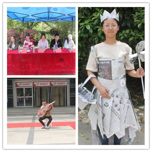 比赛分为两部分进行。第一部分是服装展示:同学们利用废弃物品做成了一件件漂亮的裙子,用CD光盘做成半身裙,用报纸做成褶皱连衣裙,用硬纸板做成军装和手枪,纷纷吸引了很多人的围观;第二部分是手工艺品展示:筷子和冰棍棒做成的小屋子仿佛给炎热的季节带来一丝凉爽,纸板制成的乐器让我们感受到了作者身上满满的文艺气息,随着模特们的精彩展示,现场氛围不断地被推向高潮。最终,韩振、马吉然组合荣获环保手工艺品一等奖;环保时装秀的一等奖获得者分别是刘悦,徐越。
