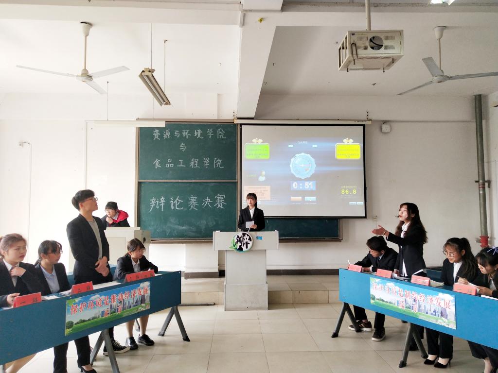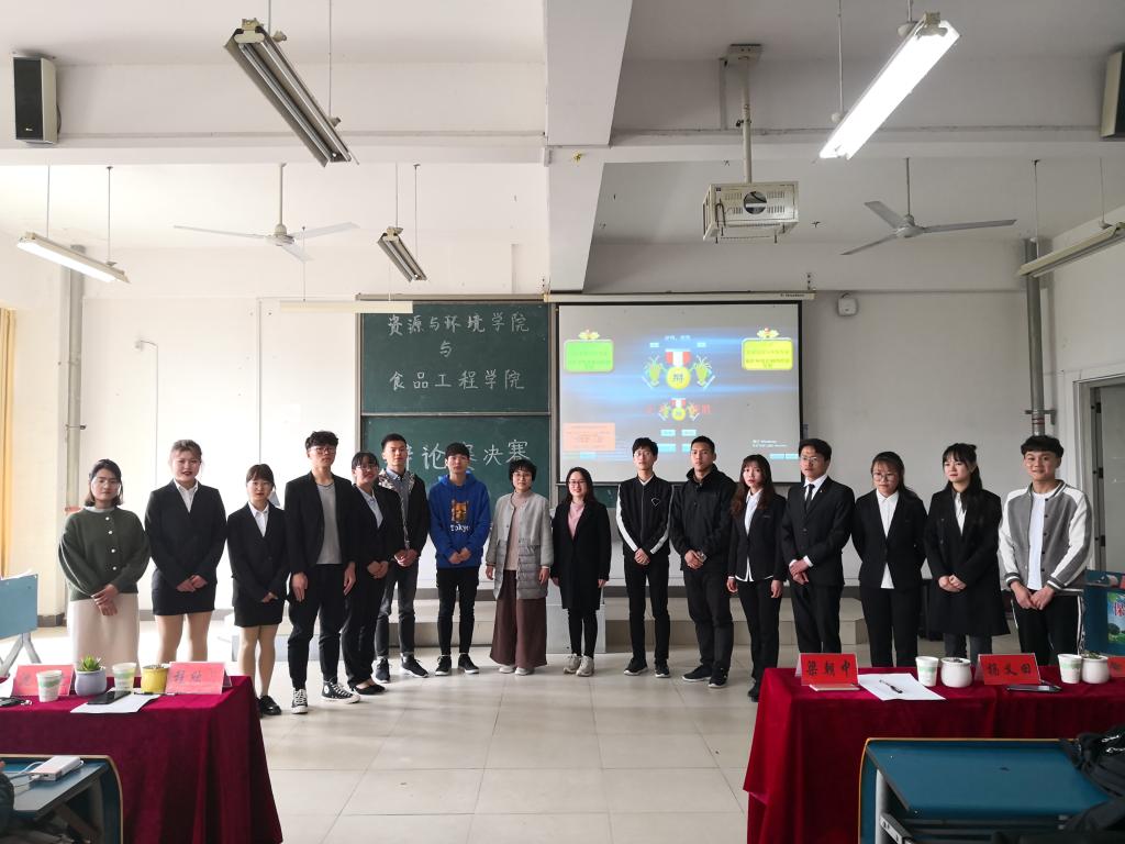 为锻炼学生的思辨和团队协作能力,营造良好的校园氛围。3月23日上午,资源与环境学院与食品工程学院于新知楼A座208教室联合举办了“生态杯”辩论赛总决赛。食品工程学院团委书记沈德艳、资源与环境学院团委副书记杨小晗、食品工程学院学生会主席程欣玥、资源与环境学院学生会主席汪旭应邀出席,动物科学学院学生会主席杨义田、建筑学院学生会主席梁朝中、校辩论队队长俞新晨、校辩论队队员潘孝舜担任评委。
