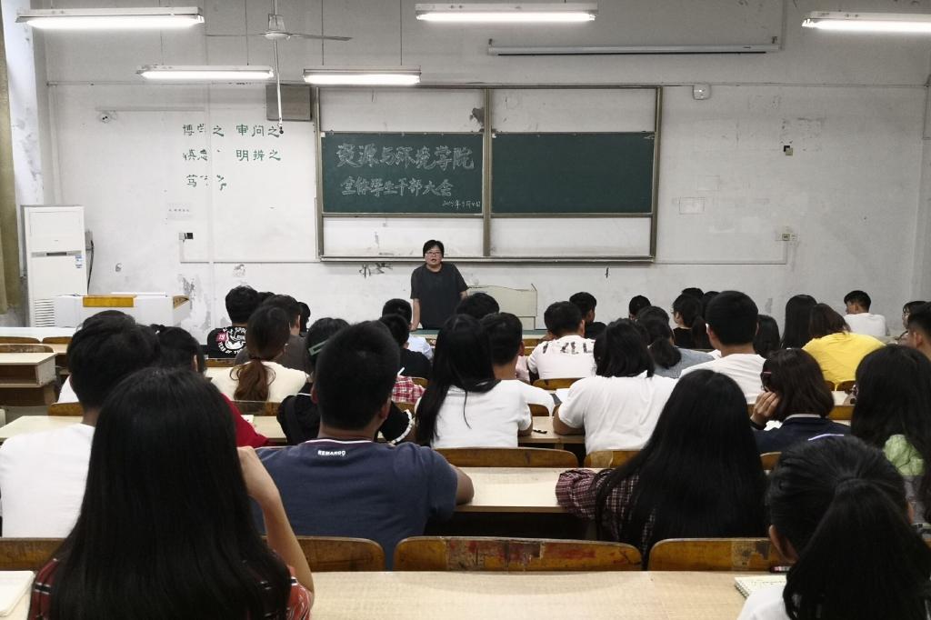 为加强学院学生干部自身素质建设,促进学习、工作能力的提高,9月4日下午,资源与环境学院在求A101召开新学期第一次全体学生干部大会。副处级辅导员谢宜勤,党总支秘书兼团委书记吴国良,专职辅导员杨小晗以及全体学生干部参加了本次会议,会议由吴国良主持。
