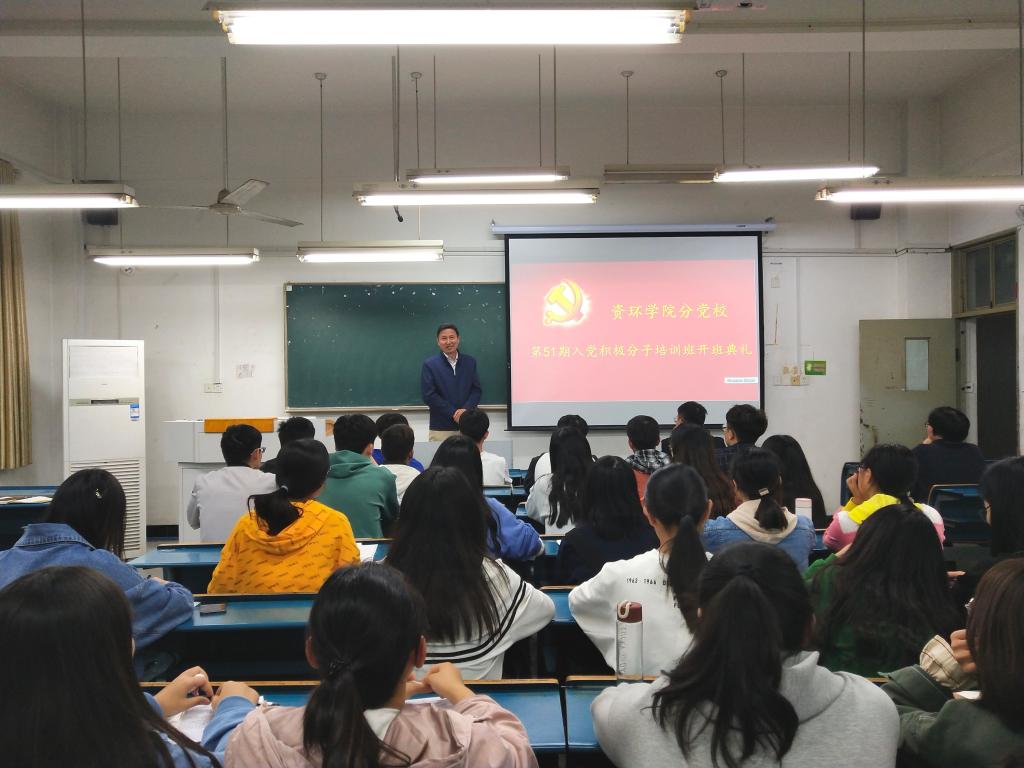 10月9日下午,资源与环境学院于求B104举办第51期入党积极分子培训班开班典礼。党总支书记李孟良、副处级辅导员谢宜勤、党总支秘书兼团委书记吴国良出席典礼,学院34名入党积极分子参加典礼。典礼由谢宜勤主持。