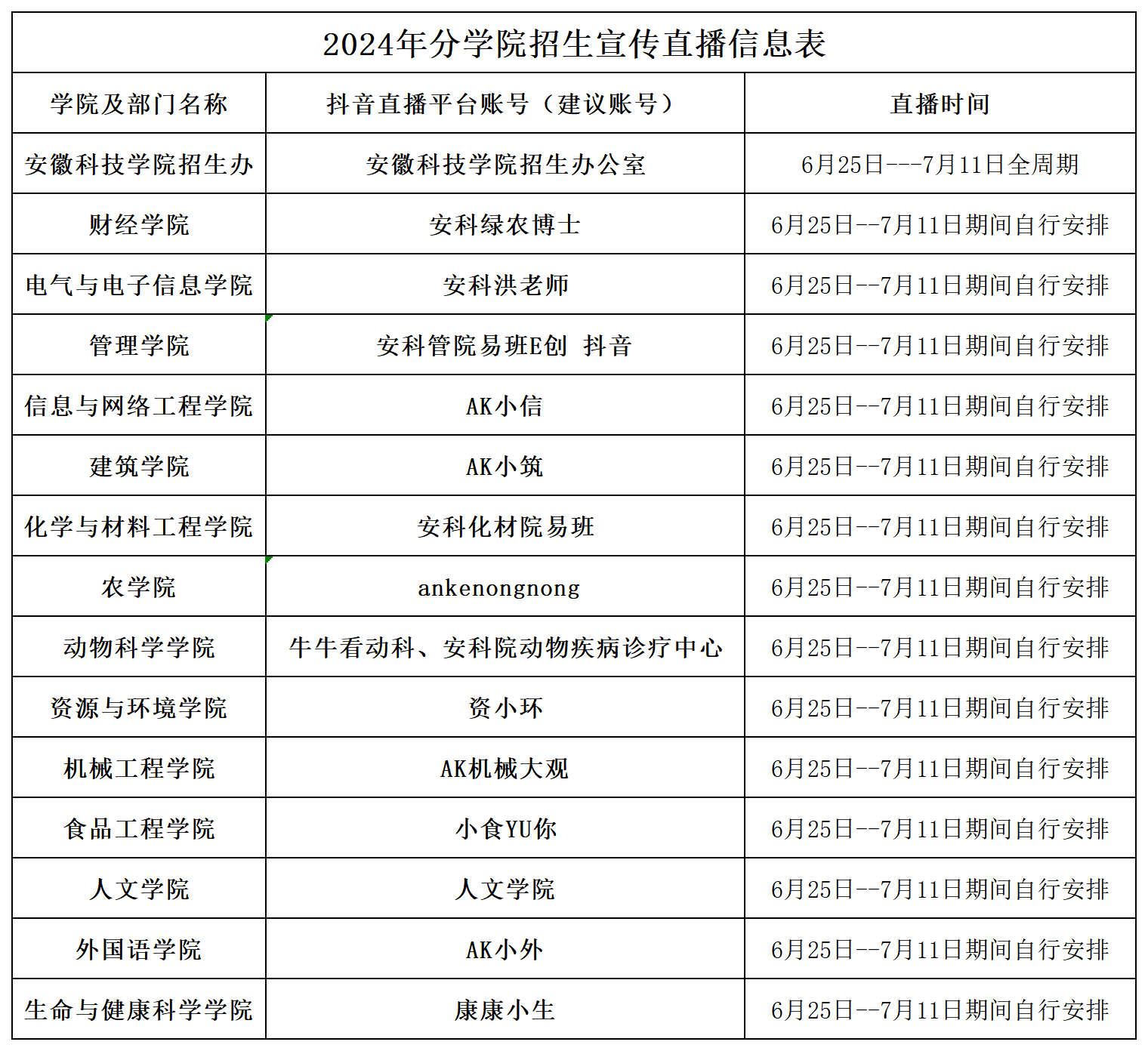 抖音搜索安徽科技学院招生办公室官方账号:“安徽科技学院招生办公室”,如官方账号未能如期直播,请加入上述官方QQ群,了解直播动态。