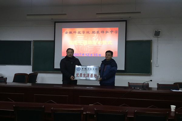 12月15日,我校与肥东县锦弘中学举行“安徽科技学院优质生源基地”挂牌仪式。校党委副书记韦文联、肥东县教体局副局长王怀宁等出席了挂牌仪式。