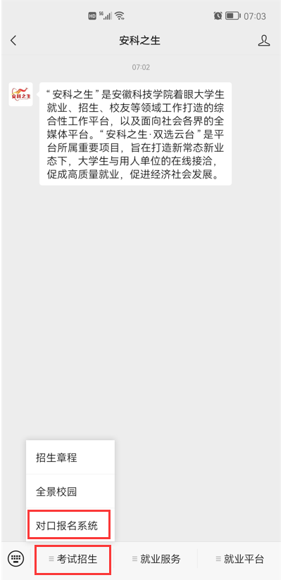 第一步:手机端请扫描下方二维码,关注安徽科技学院招生办公室官方微信公众号“安科之生”,选择“考试招生”菜单,点击“对口报名系统”。电脑端可登录http://zsbexmprint.ahstu.edu.cn/dkbm,进行后续操作。