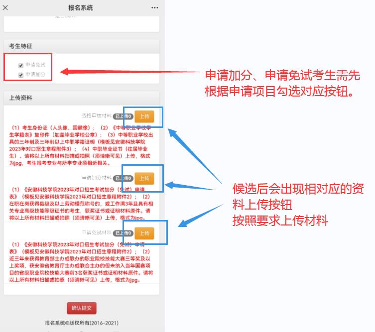 第六步:申请技能大赛免试、考试加分鼓励政策的考生,在“考生特征”板块,先勾选符合的鼓励政策选项,后按照要求上传材料审核。审核无误后,点击确认提交按钮,一旦提交,不可更改。
