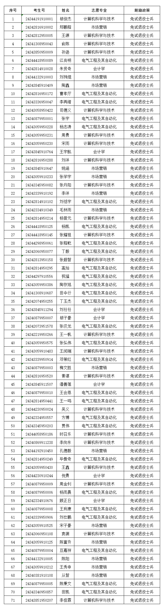 根据《安徽科技学院2024年普通高校专升本招生章程》关于申请免文化课考试退役士兵专项计划,相关要求,经审核,胡俊杰等71名考生符合申请免试条件,现予以公布。如有异议或遗漏,请于4月9日12:00前,与安徽科技学院招生办公室联系。联系电话:0550-6732041,0552-3197041。