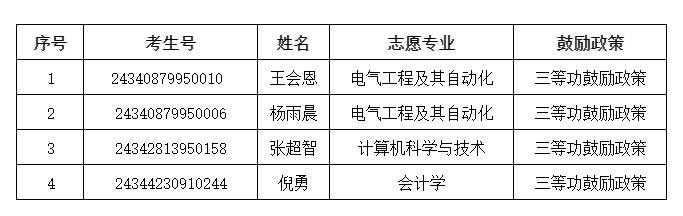 根据《安徽科技学院2024年普通高校专升本招生章程》关于申请三等功鼓励政策相关要求,经审核,王会恩等4名考生符合申请免试条件,现予以公布。如有异议或遗漏,请于4月9日12:00前,与安徽科技学院招生办公室联系。联系电话:0550-6732041,0552-3197041。
