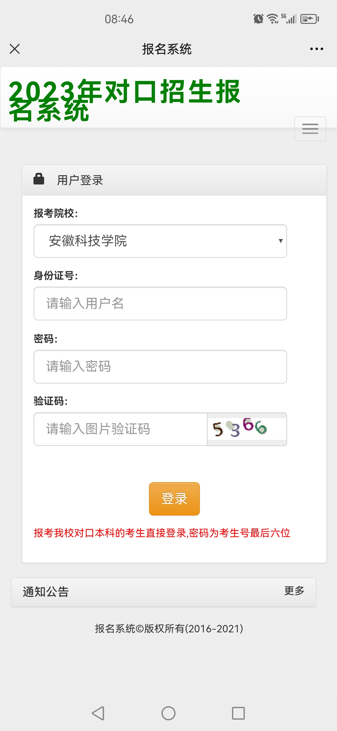 目前安徽科技学院2023年对口报名系统,主要用于考生资格审查材料上报,技能大赛免试、加分鼓励政策材料上报。如有疑问,请咨询安徽科技学院招生办公室0550-6732041,0552-3197041。(材料上传时间为4月6日-4月8日)