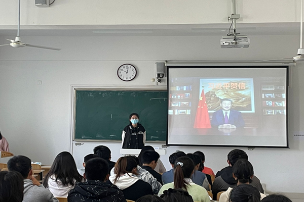 活动主要分为两个部分,第一部分由活动主持人讲解有关贺信内容和党中央支持精神的PPT。讲解人员紧紧抓住围绕以习近平同志为核心的党中央领导人民在伟大复兴事业道路上不断奋斗为主题,讲述我国人民的伟大奋斗成就。第二部分播放习近平总书记贺信视频。