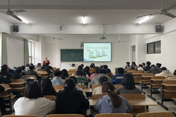 王天云首先介绍了大学生入伍优待政策,重点讲解了大学生当兵享受优先征集入伍、入伍高校新生和在校生学籍保留、国家资助学费、大学毕业生士兵可直接提干、享受一次性奖励金发放等优惠政策,这些政策充分显示国家对大学生征兵工作的重视;其次王天云分别介绍了退役大学生士兵学业优惠政策、退役大学生士兵安置和就业政策、参军入伍政治经济待遇等政策,增加同学们对退役后学业和就业的信心;最后王天云鼓励学院大学生响应国家号召,踊跃接受祖国的挑选,到部队的大熔炉中磨砺意志、锻炼品质,到部队的大学校里增长才干、成就人生,到部队的大舞台上尽展才华、建功立业,让人生在实现军梦中绽放绚丽的光彩。