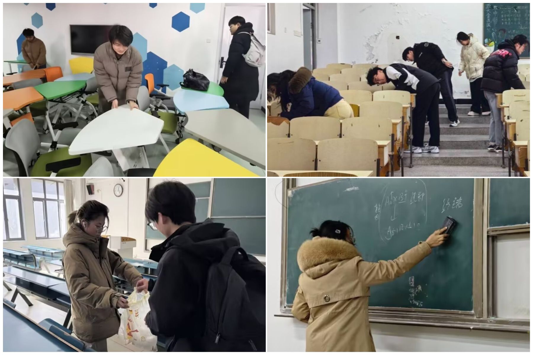 本次清扫行动覆盖求知楼A、B栋和新知楼A、B栋的教室区域。学生会各部门负责人提前统筹规划、细化任务安排,明确权益维护部、学习发展部、宣传部、实践发展部、学生联络部的清扫任务。学生会成员们手持板擦、扫帚等工具,认真清理教室的每一个角落,大家分工明确、相互协作,用双手擦亮校园文明窗口,用行动诠释劳动之美。