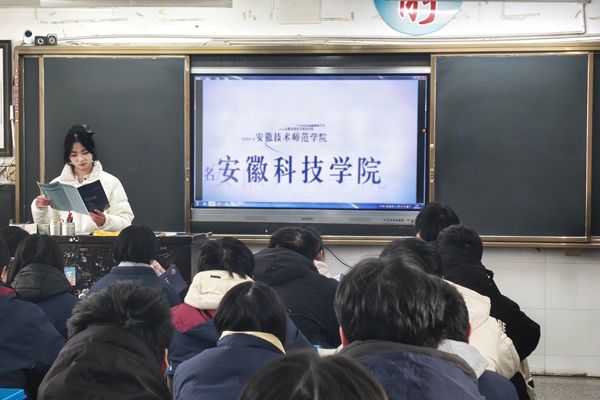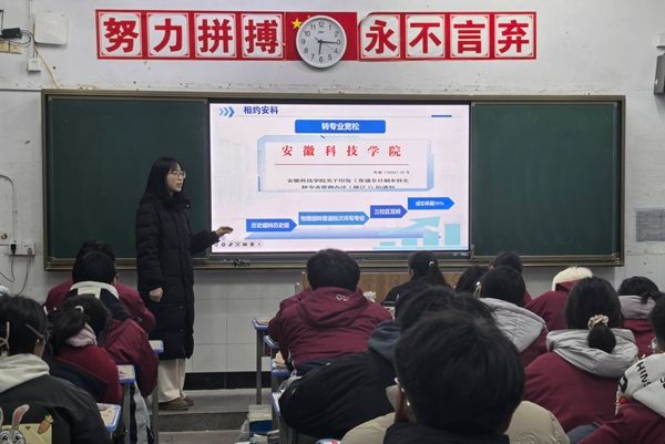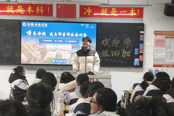 动物医学253班高顺、徐雯静赴六安毛坦厂中学开展宣讲,通过PPT展示、视频播放等形式介绍学校办学特色与动物医学专业优势,分享大学学习生活体验,并结合自身备考经历为高三学子答疑解惑。