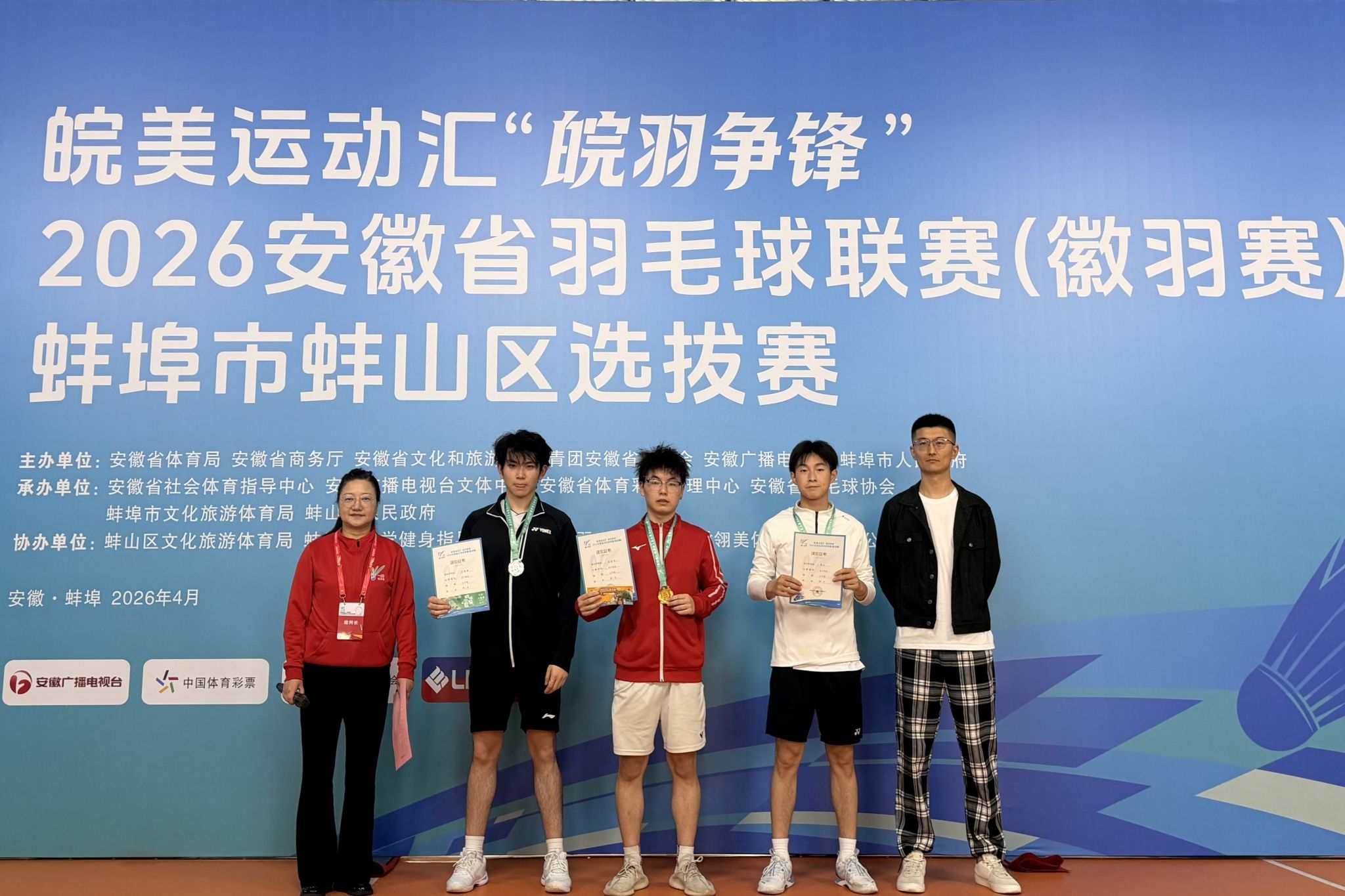 4月11日至12日,皖美运动汇“皖羽争锋”2026安徽省羽毛球联赛蚌埠市蚌山区选拔赛在蚌埠市大美体育中心举行,动物科学学院2024级兽医研究生巩容均经过激烈角逐,最终斩获男子单打公开组第一名。