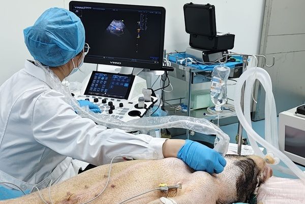 项目实施过程中,双方团队充分发挥各自领域专长,形成了“临床技术引领+麻醉技术保障”的协作模式。从术前实验方案的细化研讨,到术中操作的无缝衔接,再到术后样本采集与超声检测,双方人员打破专业壁垒,分工协作,出色完成整个手术流程。深圳市第四人民医院团队凭借深厚的临床外科功底,由赵立奇医生主刀完成血管定位、材料植入等关键操作,以精准稳健的手术技艺保障了移植操作的规范高效。手术台上,范恒华与赵立奇全神贯注,从消毒铺巾到缝合关腹,每一个动作都精准规范,最长一场手术持续了将近7小时,仍以“零差错”为目标完成每一项操作。贺绍君教授团队依托该校教学动物医院平台,由丁金雪博士带领团队成员提供专业的麻醉、动物生理监护等技术,从气管插管到生命体征监测,每一步都为手术安全筑牢防线。团队成员时刻紧盯心率、血氧、体温等生命体征,精准调控麻醉药物剂量,全力保障实验猪的生理体征稳定。团队成员全程密切配合术者开展操作、分工明确,严格按照手术节奏协助暴露视野,配合牵拉,辅助剪线等操作,以严谨细致的作风保障了手术流程的顺利进行。术前、术中、术后丁金雪运用超声技术实时检测血管吻合口血流情况,清晰地检测到颈动脉血管腔血流通畅,为试验的初步成功提供了直观依据。截止目前,四例血管移植实验猪各项生命指征正常。