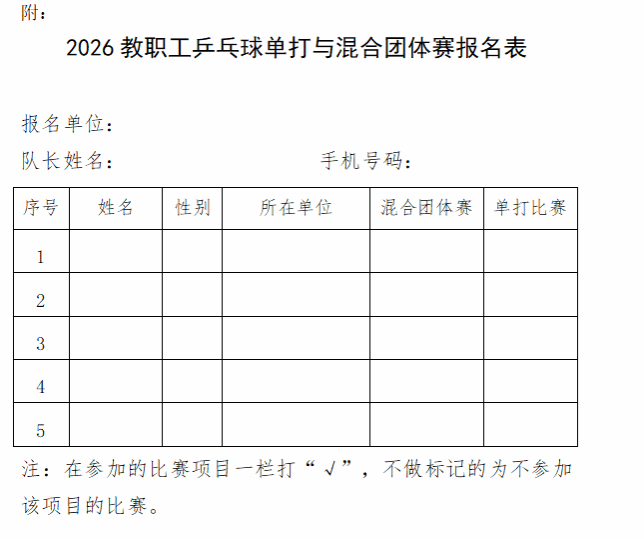 2.单打比赛,各项目每单位限报4人,混合团体比赛每队限报4人,队长1人(可由队员兼任,亦可由其他人员担任),队员至少1名为女职工,每场混合团体赛至少有1名女队员上场比赛。