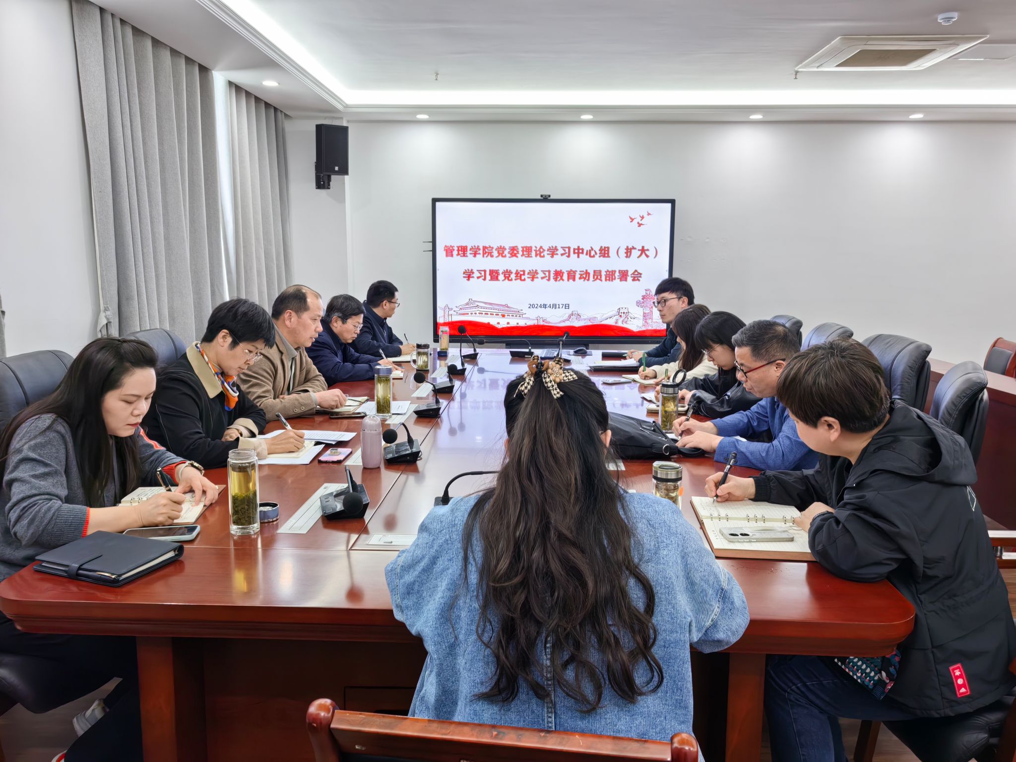 4月17日下午,管理学院在西附楼317会议室召开党委理论学习中心组(扩大)学习会,学习贯彻习近平总书记关于党纪学习教育的重要讲话和重要指示精神,动员部署学院党纪学习教育工作。学院党委班子及全体支部书记参加会议,会议由学院党委书记丁景良主持。