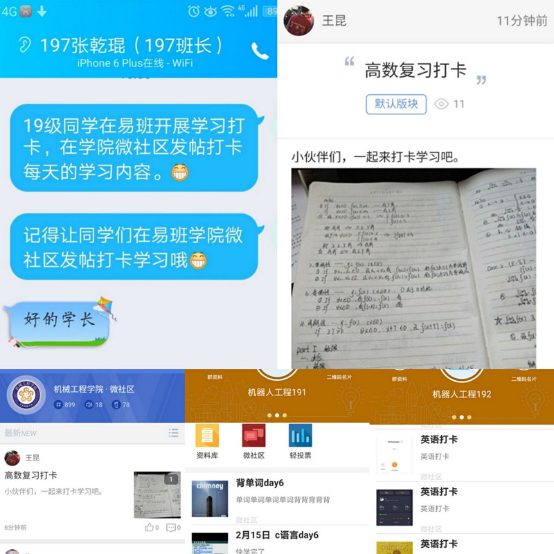 停课不停学,党员团干我先行。为落实疫情期间“停课不停学”的相关要求,引导广大同学们积极乐观在家自学、对抗疫情,支部要求全体学生党员们在易班开展学习打卡活动,并要求团建指导员深入所带学生班级开展学习动员活动。