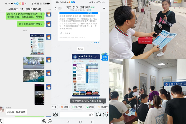 本次活动由我组成员负责,本次活动分为四个部分:一,联系本届高考生或者毕业班老师分享安徽科技学院招生宣传资料电子档;二、我组成员各自联系以前的班主任,看望班主任并向班主任汇报自入大学以来的生活和成长;三、在砀山中学校园内进行现场宣传,包括海报的张贴、宣传折页的发放、为考生解疑答惑播放我校招生视频等;四、同我校负责来砀山中学招生的老师一道,在高招会上为前来的学生及家长解疑答惑,分享我们在安科学习和生活的日常。