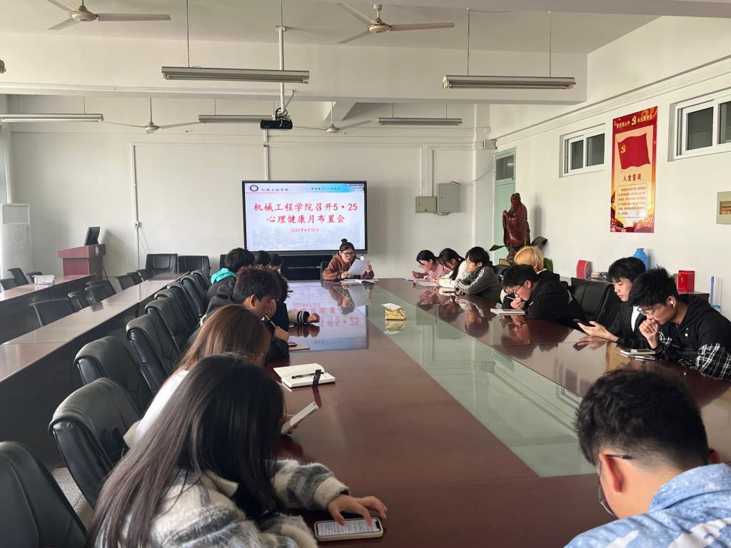 为进一步做好学生心理健康教育,营造关注心理健康、懂得心理健康、重视心理健康的浓厚氛围,更好的激发大学生心理健康自我保健意识,4月25日中午,机械工程学院在学院会议室召开本学期“5·25心理健康月”工作布置会,全体班级心理委员和心理联合会成员参加会议,会议由学院心理健康指导老师、辅导员蔡炜煜主持。