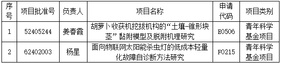 近日,国家自然科学基金委员会公布了2024年度国家自然科学基金项目评审结果,安徽科技学院机械工程学院共获批国家自然科学基金青年项目2项,获批直接经费共计60万元,实现机械工程学院长久以来国家基金零的突破。