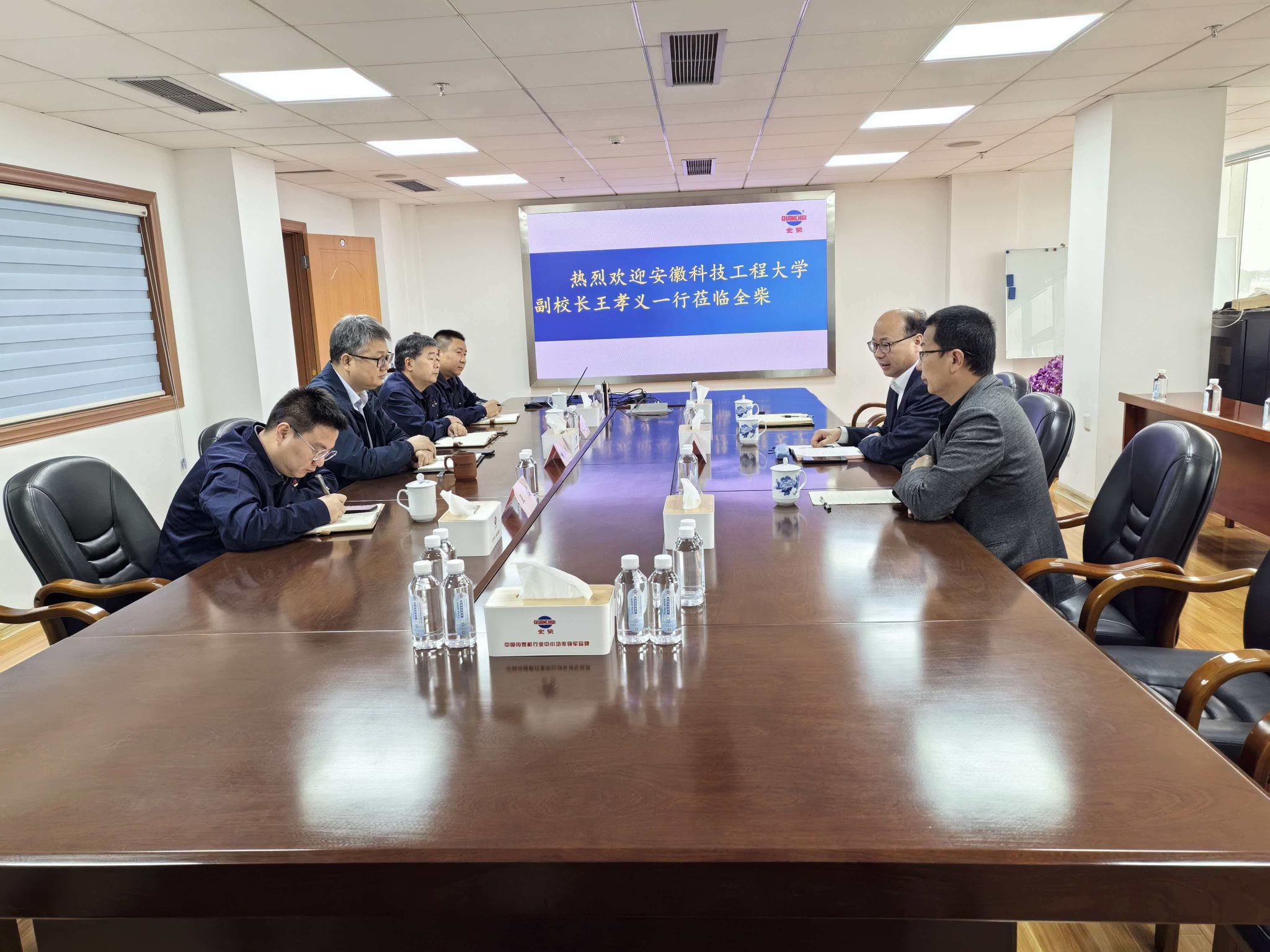 安徽全柴动力股份有限公司徐玉良董事长、全柴集团黄长文副总经理、办公室主任王成、人力资源部经理王超和技术中心副主任汪会斌等热情接待了王校长一行;座谈期间,王孝义简要介绍了学校基本情况、办学特色、人才培养等情况,希望校企在科研平台联合申报、科研项目联合攻关和人才供给等方面深入合作,进一步提升学校服务地方企业的空间,同时引进企业优质资源服务人才培养。