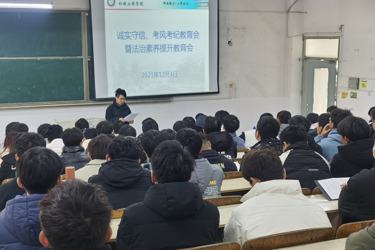 为进一步巩固学风建设成果,落实《关于组织开展学生法治素养提升专项行动的通知》精神,引导学生做好期末复习迎考工作,遵守校规校纪,严肃考风考纪,12月3日中午,机械工程学院辅导员邱杰在求知楼A101组织召开学生考风考纪及法治素养提升教育会,2019-2021级各班班长和团支书参加会议。
