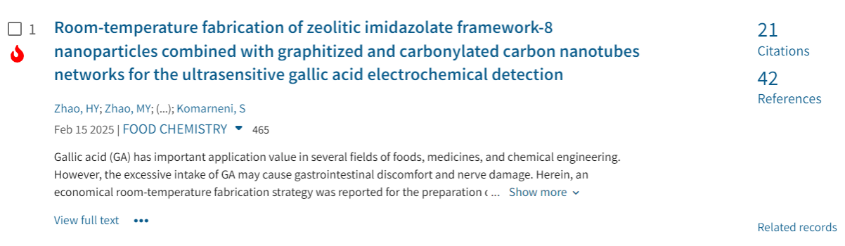 近日,Essential Science Indicators(ESI)公布最新统计数据,我校化学与材料工程学院化工新材料科技创新团队在国际顶级学术期刊《Food Chemistry》(中科院农林科学大类一区,应用化学小类一区)发表的研究论文《Room-temperature fabrication of zeolitic imidazolate framework-8 nanoparticles combined with graphitized and carbonylated carbon nanotubes networks for the ultrasensitive gallic acid electrochemical detection》入选ESI全球TOP 0.1%热点论文。