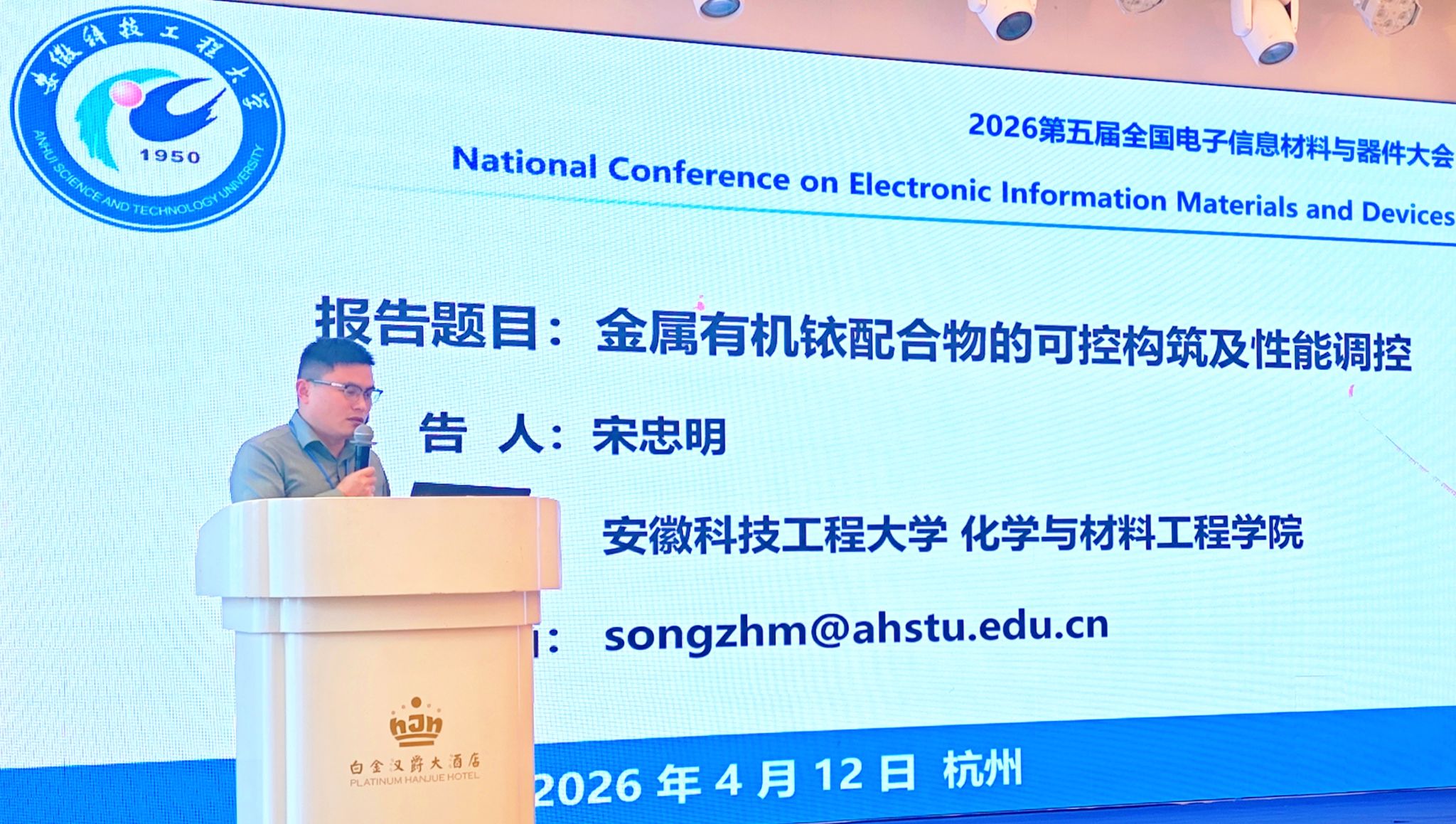 4月10日至13日,第五届全国电子信息材料与器件大会在杭州召开。我校化学与材料工程学院新能源材料与器件系主任宋忠明应邀参会作学术报告,并荣获大会颁发的优秀青年科技奖。